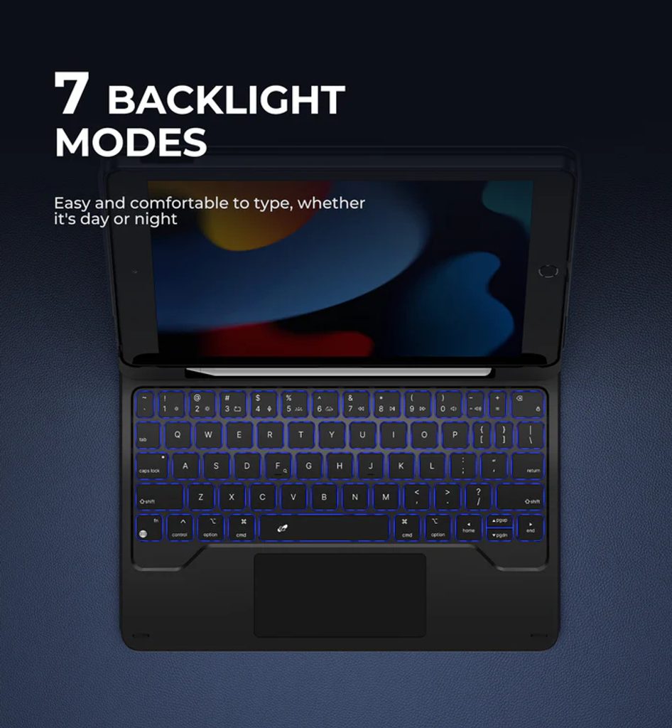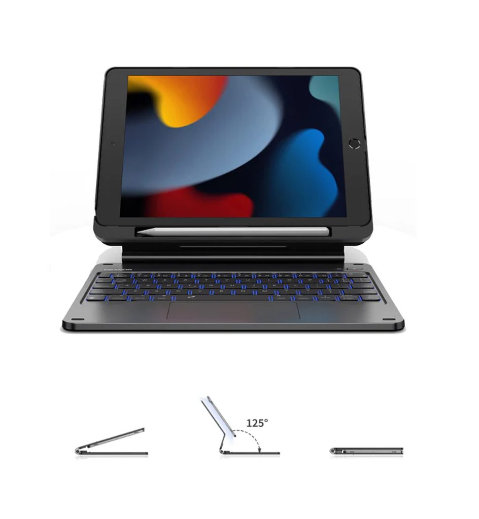 Podarite svojemu iPadu novo razsežnost s tem stilskim in praktičnim etuijem z tipkovnico! Zahvaljujoč magnetnemu stojalu, vgrajeni sledilni ploščici in osvetljenim tipkam boste uživali v maksimalnem udobju pri pisanju, brskanju in delu na poti.