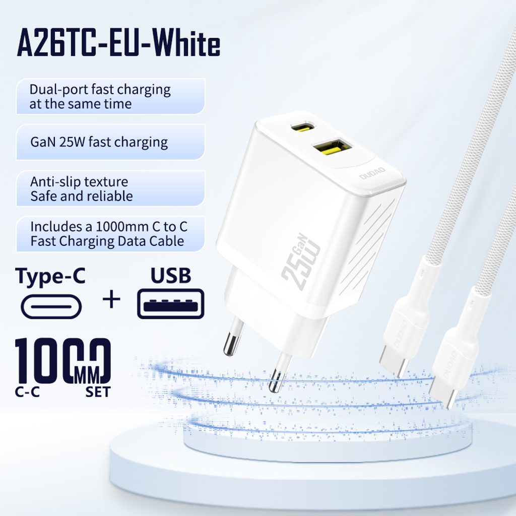 Dudao A26TCEU nabíječka USB-A + USB-C s USB-C kabelem, PD QC 25W GaN, bílá